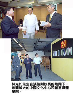 論壇前張校長引領林氏參觀了城大的中國文化中心及創意媒體學院。他對城大的發展和成就表示欣賞。林氏一直十分關注教育事業,除了捐資助教,還參與教學事務,包括出任暨南大學校董會校董、廣州華南師範大學客座教授,以及香港嶺南大學商學課程諮詢委員會委員。他也是城大商學院的協席教授。