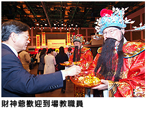 校長在團(tuán)拜活動聯(lián)同各部門主管及四位財(cái)神爺向同事拜年,並向在場的教職員大派紅封包。財(cái)神爺?shù)某霈F(xiàn),引起哄動。同事們紛紛蜂擁而上,祈求財(cái)神爺賞賜紅封包,為來年帶來好運(yùn)。
