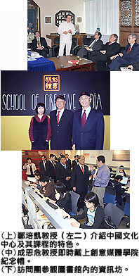 訪問團和城大多位教授在輕鬆的氣氛下交流會談後,由張校長陪同參觀中國文化中心。中心主任鄭培凱教授先介紹學科的內容和活動,然後由副主任馬家輝博士介紹大學如何透過資訊科技促進中國文化的學習。成教授讚揚課程有助培養年青人的愛國意識。