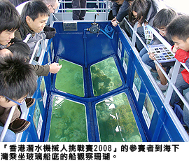 參加由世界自然基金會(huì)及香港城市大學(xué)(城大)合辦的「香港潛水機(jī)械人挑戰(zhàn)賽2008」的學(xué)生,於2月16日到海下灣海洋生物中心參加決賽前的最後一個(gè)工作坊,乘坐玻璃船底的船觀察珊瑚,進(jìn)一步了解香港的海洋生態(tài)。