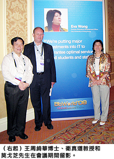 香港城市大學(城大)教育發展處處長王周綺華博士一行四人於7月15至17日出席Blackboard World ’08國際會議,分享城大使用電子平臺的心得。會議在美國舉行,同行的還有電算服務副處長莫戈芝先生、中文、翻譯及語言學系系主任衛真道教授及教育發展處高級教育發展主任黃少群博士。