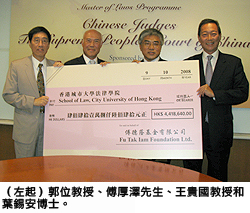 城大法律學院於10月9日舉行支票頒贈儀式,出席的嘉賓包括:傅德蔭基金有限公司主席傅厚澤先生、城大校長郭位教授、城大法律學院院長王貴國教授和城大法律學院國際顧問委員會聯席主席葉錫安博士