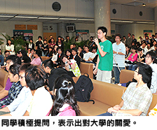 在司儀介紹過郭教授的背景及興趣後,學生便開始自由提問。眾多學生把握這一寶貴機會,在一個多小時裏積極發問,內容包括香港城市大學(城大)未來的用地發展、大學排名、畢業生出路等,更有學生即席邀請郭教授參加慈善行山活動,郭教授逐一作了回應。