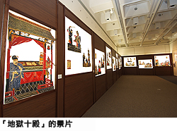 這次展出的作品中,「地獄十殿」的系列景片最為突出,這原是搬演《目蓮傳》之類皮影戲用的舞臺佈景;一幅幅圖像既描繪了陰曹地府的情景,也反映出清代的社會習俗,如「賭博」、「吃洋煙」等。