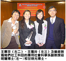 兩名得獎人都是應用社會科學系副教授甘炳光博士的學生。看到學生畢業後貢獻社會,在社工界表現出色,老師深感欣慰。「我認為,出色的社工不一定要做出轟轟烈烈的服務成績,或是有超群出眾的計劃,而要不畏艱辛,抱有堅持獻身服務弱勢社群的精神、信念與理想,這些王惠芬和王珮玲都做到了,」甘博士說。