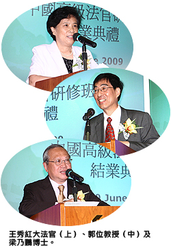除了28名內(nèi)地高級法官外,出席結(jié)業(yè)典禮的嘉賓包括中華人民共和國最高人民法院審判委員會專職委員王秀紅大法官、中華人民共和國外交部駐香港特別行政區(qū)特派員公署副特派員詹永新先生、終審法院常任法官陳兆愷博士、孖士打律師行亞洲區(qū)董事會主席兼首席合夥人羅婉文女士、城大副監(jiān)督梁乃鵬博士、城大校長郭位教授及城大法律學(xué)院院長王貴國教授。