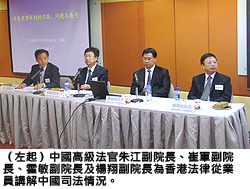 另外,該批中國高級法官代表於6月17日為本港法律專業(yè)人員舉辦講座,題目爲(wèi)「涉港商事審判的實踐、問題與展望」。講座由城大法律學(xué)院及香港法律專業(yè)學(xué)會合辦,讓法律從業(yè)員了解審決港商涉內(nèi)地商業(yè)糾紛的基本概念及原則。中國高級法官以廣東省為例子,總結(jié)涉港商民事訴訟糾紛的特色,研討金融海嘯對審判有關(guān)商業(yè)紛爭的影響和兩地法律的發(fā)展。這次講座為中國高級法官及本港法律專才提供平臺,討論處理跨境個案意見,並促進兩地的法律交流。