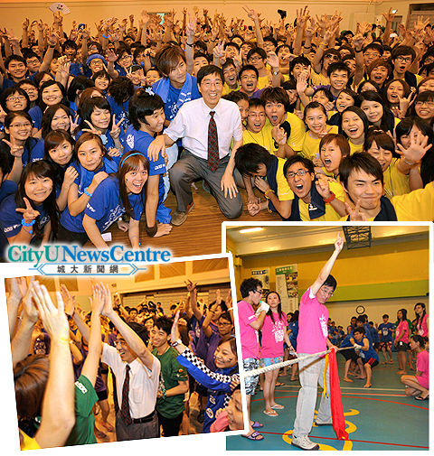 郭校長除歡迎學生成為城大一份子外,更與學生一起跳迎新舞和擔任拔河比賽的總司令,氣氛熱烈。