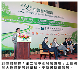 郭教授同時以葡萄牙近年來重視投資獲得的成績為例,說明危機中蘊含著許多機會。對於中國目前的經濟發展,加大投資不失為推動持續發展的強國良策。「香港的大學應在鞏固已有的學科優勢之外,積極拓展新的發展方向,」郭教授說。「值得投資的範圍很廣,能源無疑是與中國乃及世界的發展密切相關的一個領域。中國將成為全世界核工業發展最快的國家,但隨之會帶來一系列其他挑戰,如核能的原材料鈾。」