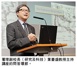 每一個領域都帶來翻天覆地的變化。如果我們仔細探究這些進步的原因,便不難發現物件的體積變得愈來愈小。我們還可以把物件的體積縮小到哪種地步,而進一步縮小體積又會帶來甚麼影響呢?要嘗試部分解答這個問題,我們必須探討體積縮小的極限:逐個原子、由下而上地建造物件,」他解釋說。副校長(發展及對外關係)王世全教授向出席人士簡介 Eigler博士,接著Eigler博士講述60年代電視連續劇《星空奇遇記》裏出現的純屬幻想的科技儀器,如今已被現有產品所超越。例如,劇集中虛構的卻克隊長使用的通訊器材,已比不上現今的手提電話。