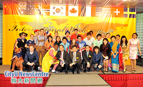 香港城市大學(城大)內地及對外事務處2月1至5日舉辦國際周,重點活動包括2月4日舉行的國旗巡遊、國際民族服裝表演及世界新年嘉年華。來自澳洲、法國、挪威、波蘭、南韓、西班牙、瑞士、美國和內地的世界各國學生,穿上民族服裝,手持所屬國家的國旗在校園內巡遊,同時介紹各民族慶新年的習俗。 城大校長郭位教授(前排左四)出席活動時表示,城大2010-2015年策略性發(fā)展計劃依據五項引導方針制訂,首項方針就是以學生為本的「促進學生學業(yè)成就和事業(yè)發(fā)展」。「我們致力培育你們成為專才,擁有卓越的專業(yè)知識和公民精神,以及成功必需的品格和毅力,」郭教授說。 副校長(發(fā)展及對外關係)王世全教授(前排左五)和副校長(學生事務)林群聲教授(前排左三)出席了國際民族服裝表演活動,與眾學生同歡共樂。 |