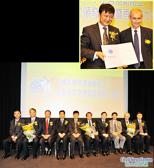 中國科學院(中科院)與京港學術交流中心5月18日舉辦「中國科學院香港新院士證書頒發典禮暨院士論壇」。三位本港學者,其中包括香港城市大學(城大)數學系菲立普.希阿雷講座教授(小圖右),從中科院副院長李靜海教授(小圖左)手中接過代表崇高學術榮譽的院士證書。城大校長郭位教授(右三)也參加典禮,擔任主禮嘉賓。
