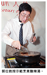 論壇開始前,郭教授即席示範烹煮酸辣湯。他表示,自小喜歡跟隨母親去菜市場,很早就對烹飪產生興趣。「人生的不同經歷,就好比酸辣湯;只有經過不同的歷練,嚐過辛酸苦辣,才會變得更堅強。所以,遇到困難時,一定不要輕言放棄,」郭教授說。