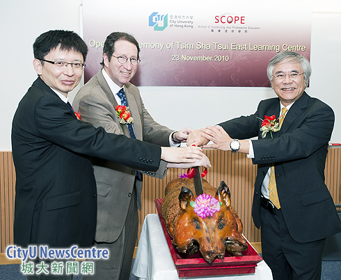 香港城市大學專業(yè)進修學院新設於尖沙咀東的教學中心,11月23日正式啟用。啟用典禮主持人是:城大學務副校長Arthur Ellis教授(中)、協(xié)理學務副校長馮剛教授(左),以及專業(yè)進修學院院長黃傑雄博士。