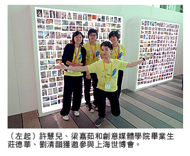 一同在上海世博參展的,還有來自多所大學的創作人,更是讓我們有機會互相觀摩,彼此切磋。這次參展,令我們得以磨練溝通表達的技巧,因為我們既要講解自己的作品,也須討論他人的創作。在上海逗留一星期之後,不但普通話大有進步,交談應對的本事也增長不少!