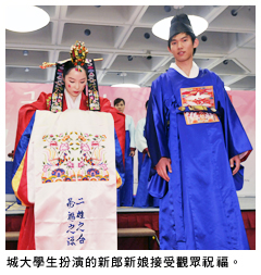 多名城大師生和居港韓國人士身著韓國傳統(tǒng)婚禮服飾,重現(xiàn)韓國習(xí)俗婚嫁喜慶的各項(xiàng)禮儀,其他包括奠雁禮(贈(zèng)送大雁)、交拜禮(新婚夫婦互拜)和合巹禮(夫婦飲交杯酒)。