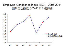 在「僱員信心指數」調查中,研究員邀請受訪者以0–10分評價自己對工作滿意度、工作安全感、工作前景及整體就業市場的看法,分數愈高表示信心愈高。結果顯示,今年的整體僱員信心指數連續第二年上升,達5.99,屬中等水平,接近2008年金融海嘯前的水平(6.04);其中以金融、保險及地產及商用服務從業員的信心最高(6.29),飲食及酒店從業員的信心最低(5.55)。對整體就業市場的信心亦上升0.7分至4.67分,雖然整體而言信心不大,但與金融海嘯前的水平距離拉近。