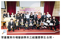 市場營銷學系修讀中國企業管理專業課程的56名畢業班學生分作七組,分別為深圳益田集團股份有限公司提供諮詢服務,深入調查及分析公司創立品牌的策略規劃,提出專業意見,並建議可行的措施。其中三組學生的專業分析和創新構想尤為出色,在7月15日舉行的「中國企業戰略管理學生優秀管理諮詢報告頒獎典禮2011」中獲得嘉獎。
