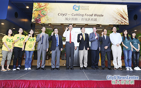 城大今天(9月26日)舉行「減少廚餘管理」活動,以求增強城大師生員工對減少廚餘、促進環保的意識。出席活動的嘉賓包括城大校董會主席梁振英先生、校長郭位教授、學務副校長李博亞教授、行政總監陳世民先生、能源及環境學院院長陳仲良教授、輔導長張楚勇博士,以及香港政府環境保護署首席環境保護主任呂炳漢先生