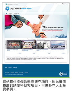 香港城市大學(城大)新推出一項名為 “Invest in CityU Students and Projects”(簡稱iCUSP)的捐助網站。在「城大 創?新未來」的主題下,網站上列出十二個教學與研究項目的資料,均為價值極高的跨學科研究項目,歡迎各界人士捐助支持。