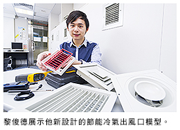 黎俊德的得獎作品名為「隨人流改變風(fēng)量的空調(diào)系統(tǒng)新構(gòu)思」。據(jù)他估算,一間朝九晚六運作的辦公室若裝上這個系統(tǒng),每月的耗電量可減少逾一成。