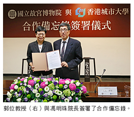 城大校長、中央研究院院士郭位教授與臺北故宮馮明珠院長代表雙方簽署合作備忘錄。馮院長表示,城大在推廣中華文化和新媒體技術的開發上經驗豐富,因此選擇與城大結為合作夥伴,共同策劃臺北故宮首次在港的借展活動。