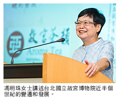 馮女士介紹說,臺北故宮的前身是1925年在北京(時稱北平)創立的故宮博物院,1965年在臺北復院,全稱為國立故宮博物院。從此典藏持續增加,博物院的組織日漸擴大,在國際博物館界的聲譽日彰。然而,近30年來,社會變遷巨大,令臺北故宮面臨許多挑戰。