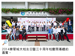 香港城市大學(城大)三千名校友、學生、教職員及其家人參與11月30日的「2014樂聚城大校友日暨三十周年校慶閉幕禮」,以多姿多彩的節目,為城大三十周年校慶作圓滿閉幕。