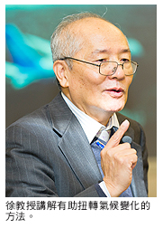 徐教授的演講題為「扭轉氣候變化的創新思路:採用低碳技術以減少碳排放」。他認為,氣候變化對地球上的生命可能發生災難性影響,因此人類不但需要尋找創新的方法減少排放溫室氣體,也即把碳用作資源而非使之變為廢棄物,而且要發明新技術並改進現有技術,例如對放射性洩露物質作冷凝處理。