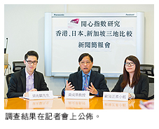 調查發現,不論是「開心指數」,或是對各方面生活質素的滿意度,香港所得的分數均低於新加坡及日本(大阪),為三地中之最低,只有「經濟」方面的滿意度處於中游。
