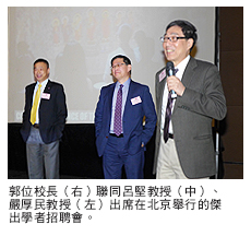 城大3月17日在北京舉行了傑出學者招聘會,來自北大、清華大學、中國人民大學等內地著名學府的50多位中外學者出席。郭校長聯同副校長(研究及科技)呂堅教授、商學院院長嚴厚民教授向在場學者介紹城大的發展近況。