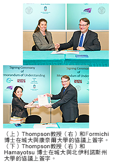 在城大舉行的合作備忘錄簽署儀式上,雙方簽訂了上述框架協議。簽字的代表是:城大亞洲及國際學系署理系主任兼東南亞研究中心主任Mark Thompson 教授、康奈爾大學東南亞研究計劃代表 Chiara Formichi 博士,以及北伊利諾斯州大學政治學系代表Kikue Hamayotsu 博士。
