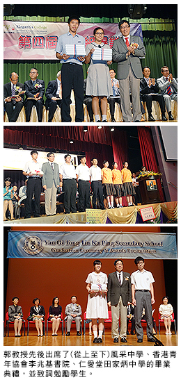 郭教授在6月25日、26日、30日,先後出席了風(fēng)采中學(xué)、香港青年協(xié)會李兆基書院、仁愛堂田家炳中學(xué)的畢業(yè)典禮。