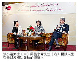 領袖論壇在頒獎禮後舉行。中國國家行政學院(香港)工商專業同學會副主席洪小蓮女士以及中原集團兼《am730》創辦人施永青先生,在論壇上暢談領袖心得。兩位講者分享自己的成功故事、人生哲學以及成功領袖的特質。?