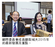 梁博士簡要回顧了城大2015年的一些重要發展,包括大學排名、研究成果、社會支持、知識轉移,以及師生和校友的同心協力。他隨後向任期即將在本年年底屆滿的委員致謝。