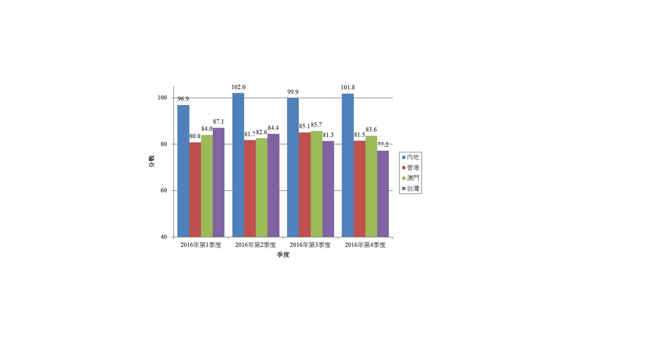 將兩岸四地的2016年第四季度消費者信心互相比較,可見中國內地的信心最高(101.8分),隨後是澳門(83.6分)、香港(81.5分)及臺灣(77.2分)(詳見圖一)。中國內地消費者信心指數較上季度上升1.9分,香港、澳門及臺灣則比上季度分別下跌3.6分、2.1分及4.1分。