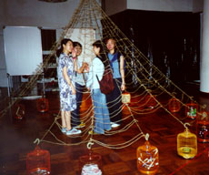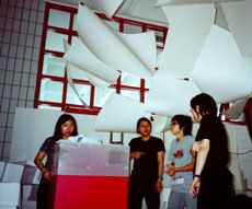 Millie Chan's exhibit, Disintegrate The Simultaneous Dress, featured a two-by-four-metre area wrapped in dark cloth. Outside the room, several white T-shirts were placed on the floor, and a viewing screen hung on a wall. Inspired by the tunnel linking CityU and Festival Walk, Chan said her multimedia boutique allowed visitors to design their own clothes, which were then shown on the display screen by an overhead projector.