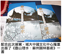 然的完美融合,充分展示了中國園林的美學。蘇州目前仍存有30多個在明清時期建造的園林,其中有九個被聯合國教科文組織(UNESCO)列爲世界文化遺産。鄭教授說﹕「蘇州園林是現存古代中國園林中最精采的一批,它們反映了中國傳統知識份子的哲學及美學,並且與中國詩畫有著千絲萬縷的聯繫。」他希望展覽將爲今年修讀中國文化中心課程的2,000多名學生提供一次學習中國美學與哲學的機會。爲了幫助學生及公衆更深入認識蘇州園林藝術,中國文化中心還配合此次展覽,出版了《疊山理水:蘇
