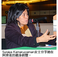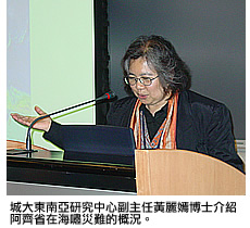 座談會先由應用社會科學系副教授兼東南亞研究中心副主任黃麗嫣博士介紹阿齊省在海嘯災難前後的概況,包括當地弱勢社群的需要,以及民間組織的角色;接著由來自該省的中心訪問學者Suraiya Kamaruzzaman女士分享她在災後到阿齊省協助劫後餘生的親友及災民的親身經歷。「這次天災令阿齊省面目全非:房屋倒塌、村落盡毀、屍橫遍野、居民流離失所……」Kamaruzzaman女士一邊向與會者描述她在當地拍下的照片,一邊以沉重的心情述說她的所見所聞。席間,Kamaruzzaman女士還展示了一份阿齊省的報章,說當地每天都刊登一批批失縱人士的照片,而其中她的一位朋友亦在名單之列。「災難過後,生還者都不斷尋求方法離開當地;但亦不斷有人進入災區尋找生死未卜的家人。」說起滿目瘡痍的家鄉、已去世或下落不明的親友、以及亟待援助的孤兒寡婦,她已熱淚盈眶。