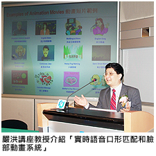「實時語音口形匹配和臉部動畫系統」由城大電腦工程和資訊科技系嚴洪講座教授研究開發。嚴洪教授表示: 「該個系統可以處理多種複雜的多媒體數據,如分析語音、圖像、影片、壓縮數據及把臉部資料數據化等,將人或動物的臉的圖像製成動畫。動畫人物的圖像可以來自相片或卡通繪圖, 用家可在大量人物或動物中選擇他自己所喜愛的圖像作為動畫人物。系統可實時製作每秒二十格的動畫,並且可以自動將動畫人物的嘴型和聲音訊息匹配,既快速又流暢。此外,動畫人物還可以有不同的表情如憤怒 、微笑及大笑, 並可採用中文(廣東話及普通話)、英語、法語、德語、日語及西班牙語等多種語言操作。」