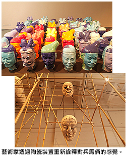 四位參展藝術家鍾愛陶藝及影像裝置的創作,曾在本港、歐洲、美國、韓國、日本及內地舉辦陶瓷裝置展覽。在是次展覽中,鄭禕以士兵為題,以抽象方式融合具象主義,表達她對兵馬俑的感受。她的其中一件作品混合了自己的創作經驗及對中國文化的新發現,以抽象的手法使用具象主義和畫像形式;另一件作品則以56個頭像表現中國56個不同民族,在兵馬俑的臉放上毛澤東的臉具,使陶俑從一個大型裝置轉化為一群戴著面罩的英雄。羅士廉透過展品「陶偶」,表達他對兵馬俑這遺跡群背後的想象,探討權力與人性的關係。謝明莊反思人會因不同時代、不同社會文化背景取捨對歷史的詮釋,嘗試在展品中陶塑現今香港,讓受眾發展出豐富多變的聯想。黃麗貞以戰士盔甲為題的裝置創作,經歷前代偉大工匠走過的旅程,表達她在陶片結合及裝置過程中得到的啟示。
