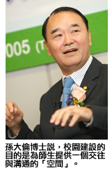 校園發展應配合大學未來整體的發展。孫博士已連續兩屆出任校董會成員,目睹城大不斷進步。他深信城大的未來必須與香港的發展互相配合。誠然金融、旅遊、物流等是香港經濟發展的重要支柱,但孫博士認為更不能忽視教育。他表示香港是一個資訊發達的國際城市,城大若能積極發展香港的高等教育,鞏固本身的軟件及硬件,讓世界各地學生以前來城大進修為榮,香港的教育事業必有很大的發展空間。他說:「只要我們抱著共同的信念,同心協力,定能成功。」