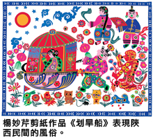 楊妙芹和女兒李雲俠出生於陝北黃土高原農家,母女倆受世代傳承的黃土地民俗文化哺育,成為民間剪紙藝術的佼佼者。她們的剪紙作品表現了陝北黃土高原的農家生活和民俗風情,充滿了陝北農家婦女的純樸、厚道、善良、賢慧的思想感情,反映了陝北勞動人民的人生觀、哲學觀、道德觀、價值觀、審美觀。是次展出的剪紙作品,不僅具有深邃的民俗文化內涵,而且具有生動的意象造型方法和表現手法。展出的作品包括《劃旱船》、《懶貓失油》、《回娘家》、《婆婆訓媳》、《群鼠偷蛋》、《豐收》及《千手佛》等等。