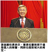 張教授作爲高等教育界的領袖人物,在推動文化交流,以及推動城大與內地高等教育的合作方面,皆作出了不少貢獻。張教授在答辭中稱,他能獲頒名譽教授,不僅是個人的榮譽,同時也是對城大的肯定,是對城大與北大長期以來交往合作的認可。