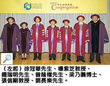 此外,城大亦頒授榮譽博士學位予鳳凰衛視控股有限公司主席兼行政總裁劉長樂先生、國家科學技術部部長徐冠華先生,以及香港大學名譽內科教授楊紫芝教授。(榮譽博士簡介)