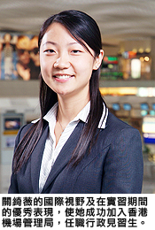 在求學階段即可學以致用,並能體驗實際工作環境,」關綺薇說。她表示,在機管局的實習經驗加深了她對國際化機場運作的了解,自此關綺薇便以加入機管局為目標。最後,憑著她在實習期間的優秀表現,及其優異的學業成績,關綺薇終於如願以償,在2,000多名投考的畢業生中脫穎而出,成為最終獲聘的四名見習生之一。