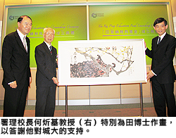 城大署理校長何炘基教授在典禮上致辭時感謝田博士對城大的支持,他說:「田博士的捐贈協助大學開拓和發展與內地高等學府的學術交流活動,促進兩地教學和科研成就,提升大學學術成果。」何教授更親自繪畫了一幅名為「迎春曲」的國畫送給田博士以表謝意。