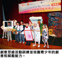 創意思維活動源自美國,是富有教育意義的學生思維訓練活動,旨在透過團隊合作,訓練並培養青少年的創意和解難能力。青少年可透過解決一系列極具挑戰性,但沒有指定答案的問題,學習如何擴闊思維領域,勇於表達原創意念。