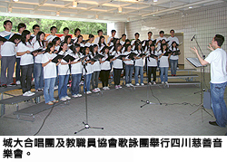城大社群賑災的熱誠持續,其中城大合唱團及教職員協會歌詠團於6月3日下午舉行慈善籌款音樂會,用歌聲送暖四川。約70名學生和教職員參與演出,唱出20首歌曲,短短個半小時已為災民籌得港幣55,939元。款項將全數撥捐香港紅十字會。而城大管弦樂團將應培才教育基金邀請,於6月5日晚上參加在中環聖約翰座堂舉行的「關愛明天音樂會」,為災民籌款。