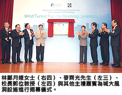 風洞設施揭幕儀式的主禮嘉賓包括發(fā)展局局長林鄭月娥女士、發(fā)展局常任秘書長(工務)麥齊光先生、城大校長郭位教授、學務副校長何炘基教授、副校長(研究)王世全教授、科學及工程學院院長陳志豪教授、建築系系主任陳錦順教授及負責風洞設施的蔡昌全教授。